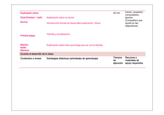 El documento presenta un plan de clase cuya competencia es analizar el desarrollo social de los niños en diferentes etapas. La clase tendrá una duración de 1 hora y 30 minutos e incluirá actividades antes, durante y después de la clase. Durante la clase, se explicarán teorías sobre el desarrollo como la de Erikson e Izahi, y se discutirán temas como la familia, familias no nucleares, y el desarrollo de las relaciones entre pares. La clase concluirá con una sopa de letras como actividad de c