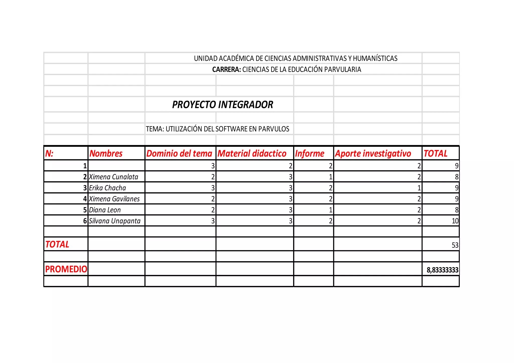 La tabla muestra las calificaciones de 6 estudiantes en un proyecto integrador sobre la utilización de software en parvulos. Los estudiantes fueron calificados en dominio del tema, material didáctico, informe y aporte investigativo. La estudiante Silvana Unapanta obtuvo la calificación más alta con un total de 10, mientras que el promedio general fue de 8.8.