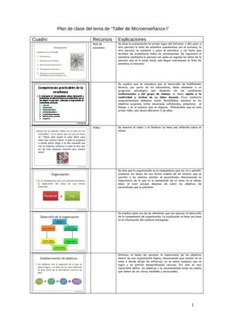 1) El documento presenta un plan de clase para el tema de "Taller de Microenseñanza I". Incluye explicaciones sobre diferentes recursos y técnicas didácticas como presentaciones, videos y dinámicas grupales.