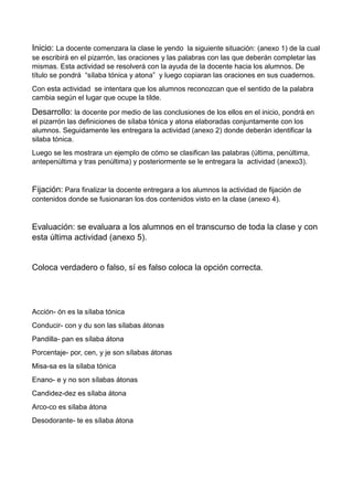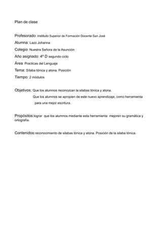 El plan de clase describe una lección de 2 módulos sobre sílabas tónicas y átonas para el 4o grado. La maestra comenzará con una actividad para que los estudiantes reconozcan cómo cambia el significado de las palabras según la posición de la tilde. Luego definirán sílabas tónicas y átonas y practicarán identificando la sílaba tónica en palabras. Finalizarán fusionando los contenidos en una actividad de fijación para evaluar el aprendizaje.