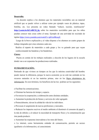 Este plan de clase propone una actividad para 1o grado sobre materiales reciclables. Los estudiantes serán divididos en grupos para hacer banderas y banderines de Argentina usando materiales como cartón, papel, tapas y botellas. La maestra explicará qué son los materiales reciclables y mostrará un video. Luego los estudiantes trabajarán en grupos para hacer sus productos, los cuales presentarán al final de la clase.
