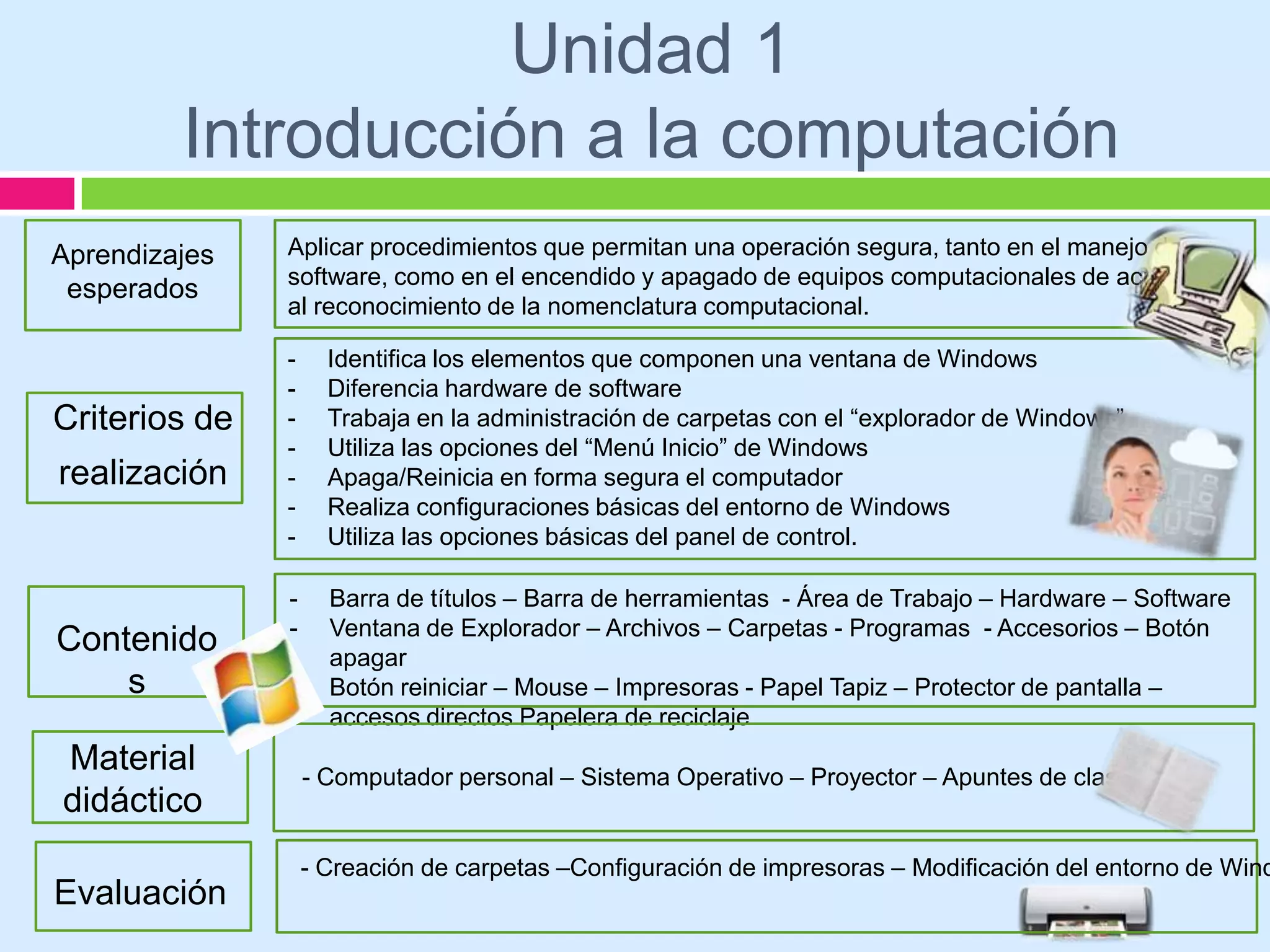 Este plan de clases presenta un curso de computación de 64 horas dividido en 4 unidades. La primera unidad introduce conceptos básicos de computación. La segunda y tercera unidad enseñan el uso de los programas MS Word y MS Excel respectivamente. La cuarta unidad cubre el uso de MS PowerPoint para crear presentaciones. Cada unidad incluye aprendizajes esperados, criterios de realización, contenidos, materiales y formas de evaluación. El plan utiliza métodos teórico-prácticos y lista manuales de usuario como bibliografía.