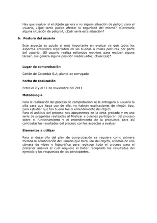Este documento presenta un plan para evaluar una silla diseñada para modelistas a través de 6 aspectos: 1) entendimiento del objeto, 2) antropometría, 3) apropiación, 4) uso vs confort, 5) seguridad, y 6) postura del usuario. La evaluación se llevará a cabo dándole la silla a los usuarios en Cartón de Colombia S.A. sin instrucciones para ver su entendimiento. Se grabará y se harán preguntas después para comparar con los aspectos a evaluar.