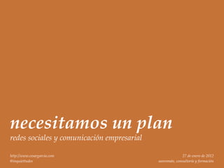 El documento proporciona consejos para crear un plan de comunicación en redes sociales efectivo. Recomienda escuchar a otros usuarios, crear contenido relevante para el público objetivo, y usar múltiples plataformas como Twitter, Facebook y LinkedIn para conversar y establecer una presencia en línea. El objetivo final es aprovechar las redes sociales para comunicarse de manera transparente y bidireccional con otros.