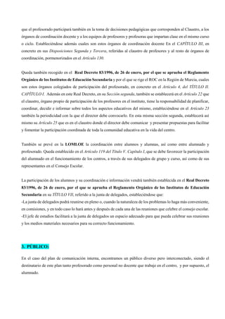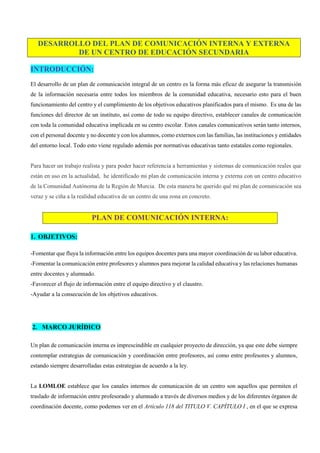 El documento presenta un plan de comunicación interna y externa para un centro de educación secundaria. El plan incluye canales y contenidos de comunicación entre el profesorado, personal y estudiantes internamente, así como con familias y la comunidad externamente. El objetivo es asegurar la transmisión efectiva de información para mejorar la coordinación, participación y consecución de objetivos educativos en el centro.
