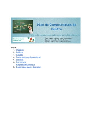 El documento describe un plan de comunicación para un centro educativo, cuyo objetivo principal es crear un clima escolar positivo y fomentar la participación de todos los miembros de la comunidad educativa. Se abordan públicos clave, canales de comunicación, contenidos, acciones necesarias para implementar el plan y la gestión de derechos de autor y de imagen. El plan también contempla la formación de un equipo de comunicación y el uso de diversas plataformas para asegurar una comunicación efectiva entre alumnos, docentes y familias.