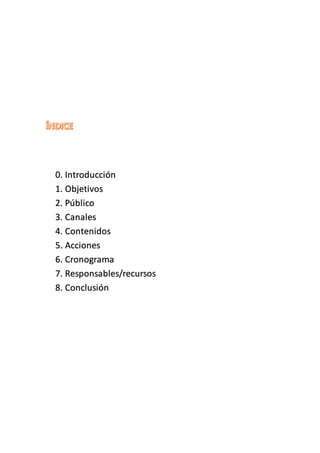 Este plan de comunicación tiene como objetivo mejorar la comunicación entre los diferentes miembros de la comunidad educativa del CEIP Princesa de Asturias, incluyendo profesores, familias, alumnos y personal del centro. Se proponen varios canales de comunicación como la página web del centro, correo electrónico, redes sociales y la plataforma ITACA. También se establece un cronograma para la implementación gradual del plan durante los próximos tres cursos escolares, designando responsables como el director y el equipo directivo.
