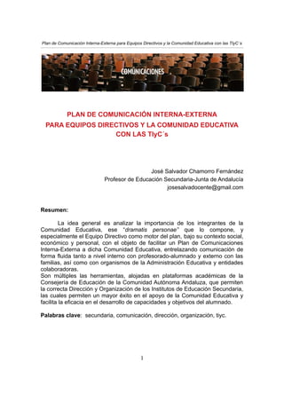 El documento detalla un plan de comunicación interna y externa dirigido a equipos directivos y la comunidad educativa, centrado en el uso de tecnologías de la información y comunicación (TIC) para mejorar la comunicación y la colaboración. Se proponen objetivos como fomentar canales de comunicación, actualizar infraestructuras tecnológicas y realizar un periódico digital, destacando la importancia de la participación activa de alumnos, familias y organismos educativos. Además, se establece un cronograma y responsables para la implementación y seguimiento del plan, enfatizando la necesidad de adaptarse a las transformaciones digitales.