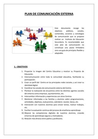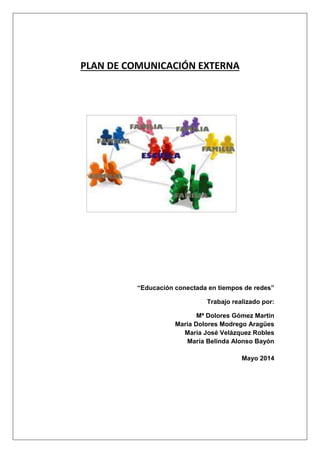Este plan de comunicación externa propone el uso de varios canales como la página web, blog, redes sociales y correo electrónico para comunicarse con la comunidad educativa, incluyendo alumnos, profesores, familias y otras entidades. Se designará un coordinador y se capacitará a los profesores para utilizar herramientas como Moodle y Google Drive. El plan también incluye contenidos, acciones, responsables y un cronograma para su implementación a lo largo del año escolar.
