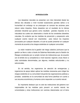 Este documento presenta un plan de contingencia para mitigar los efectos de un sismo en la Escuela Bolivariana Antonio José de Sucre. El plan tiene como objetivo principal diseñar estrategias para reducir el impacto de un posible terremoto. Los objetivos específicos incluyen identificar los conocimientos actuales sobre sismos, determinar los pasos a seguir ante un sismo, y elaborar un plan de contingencia basado en las necesidades de la escuela.