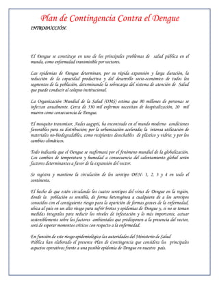 Este documento presenta el Plan de Contingencia Contra el Dengue del Municipio de Venadillo, Tolima para el año 2013. El plan tiene como objetivos prevenir y mitigar el impacto de una epidemia de dengue mediante la detección temprana de brotes, así como optimizar la capacidad de respuesta de los servicios de salud y la comunidad. El plan incluye componentes de vigilancia epidemiológica, de laboratorio, entomológica y de control vectorial, así como promoción de la salud y comunicación durante periodos interepidémicos y