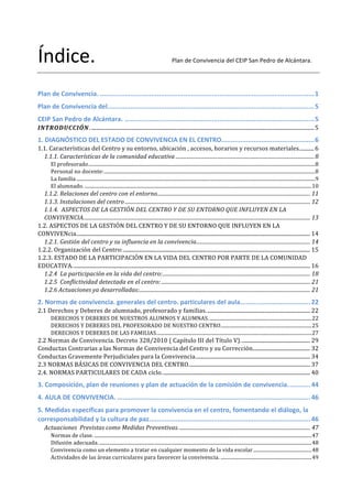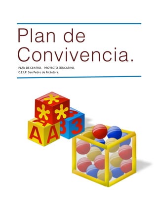 Este documento presenta el Plan de Convivencia del CEIP San Pedro de Alcántara. Incluye un diagnóstico de la situación actual de convivencia en el centro, las normas de convivencia generales y particulares para cada ciclo, y las medidas para promover la convivencia, prevenir y resolver conflictos. El objetivo es establecer las bases para una convivencia pacífica, responsable y participativa entre toda la comunidad educativa.