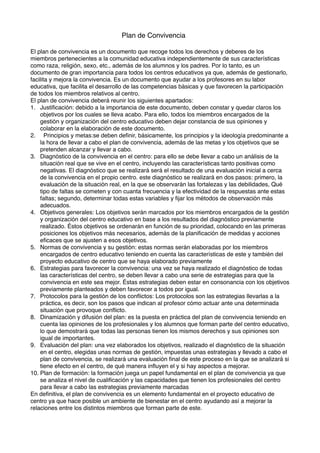 El plan de convivencia es un documento que establece los derechos, deberes y normas de convivencia para todos los miembros de una comunidad educativa. Incluye un análisis inicial de la situación, objetivos generales, estrategias para mejorar la convivencia como protocolos para gestionar conflictos, y una evaluación final para medir el impacto en el centro y posibles mejoras. El plan es fundamental para crear un ambiente de bienestar que mejora las relaciones entre todos los involucrados en el proyecto educativo.
