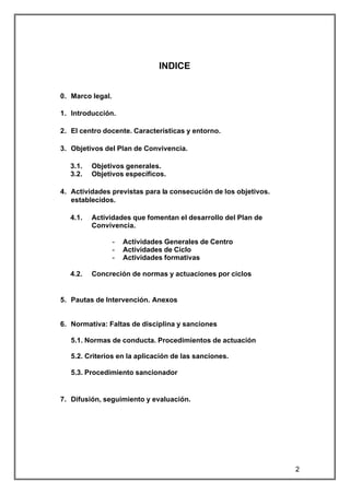 Este documento presenta el Plan de Convivencia de un centro docente. Establece el marco legal que rige los planes de convivencia y describe las características del centro y el entorno. Los objetivos generales incluyen conseguir la integración de todo el alumnado, fomentar las relaciones entre la comunidad educativa y prevenir conflictos. También detalla las actividades planeadas para lograr los objetivos, como actividades para fomentar la participación, habilidades sociales y la interrelación entre la comunidad educativa.