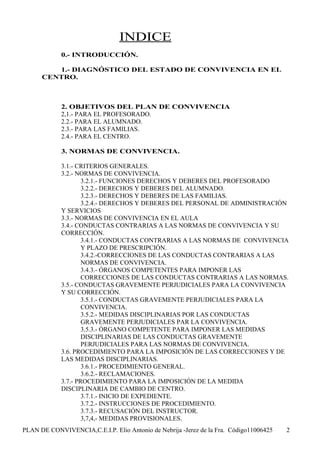 Este documento presenta el plan de convivencia de un centro educativo. Establece objetivos generales como promover la cultura de paz, mejorar la convivencia y fomentar valores como el respeto. Los objetivos específicos incluyen concienciar al profesorado sobre la convivencia intercultural y de género, dotarlos de herramientas para gestionar conflictos, e implicar al alumnado en la prevención y resolución de problemas de convivencia.