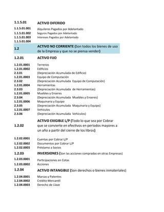 Este documento presenta un modelo básico de plan de cuentas para una empresa. Describe las cuentas de activos, pasivos, patrimonio, ingresos, costos y gastos agrupadas en cuentas corrientes y no corrientes. El plan de cuentas permite clasificar y registrar las transacciones financieras de una organización de manera ordenada.