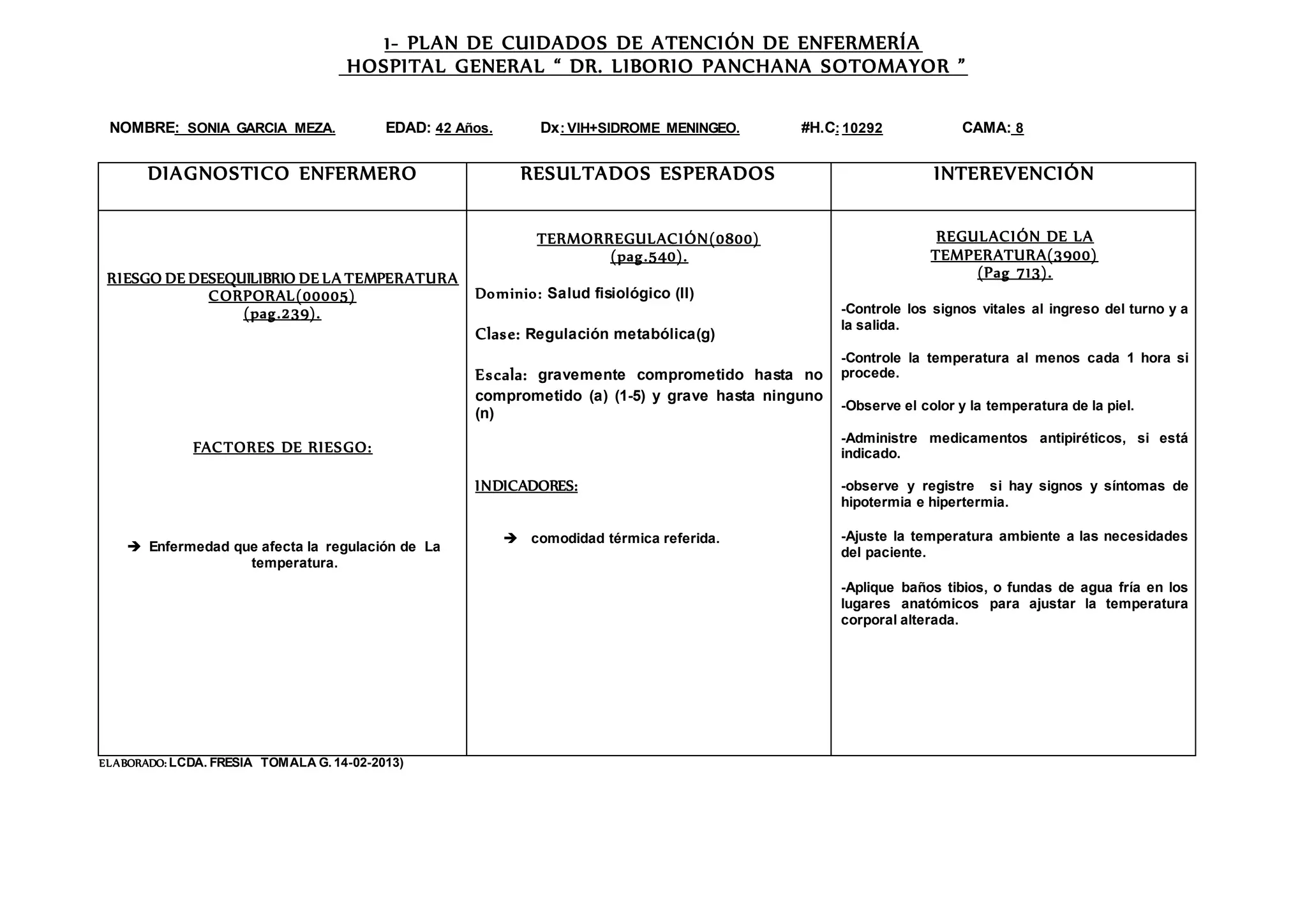 Este plan de cuidados de enfermería describe las intervenciones para Sonia García Meza, una paciente de 42 años con diagnóstico de VIH y síndrome meníngeo. El diagnóstico de enfermería es riesgo de desequilibrio de la temperatura corporal debido a su enfermedad. Las intervenciones incluyen monitorear signos vitales y temperatura cada hora, administrar medicamentos antipiréticos si es necesario, y ajustar la temperatura ambiente para mantener la temperatura corporal del paciente.