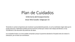 Este plan de cuidados resume la situación de una paciente de 74 años que fue hospitalizada por un cuadro de dolor abdominal y sangrado. El resumen incluye diagnósticos sobre el control de la diabetes, deambulación segura, eliminación intestinal y estilo de vida saludable. El plan describe intervenciones de enseñanza, prevención de caídas y control intestinal para mejorar la autonomía y salud de la paciente.