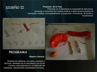 El documento presenta el programa de Diseño II. Su objetivo general es estudiar los sistemas, principios y técnicas de la naturaleza y el ser humano para aplicarlos en el desarrollo de artefactos que solucionen necesidades humanas. Entre sus competencias se encuentra identificar las funciones del diseño como la formal estética, práctica y simbólico-comunicativa. La metodología incluye exposiciones teóricas, análisis de mapas mentales y desarrollo de prácticas aplicando los tem