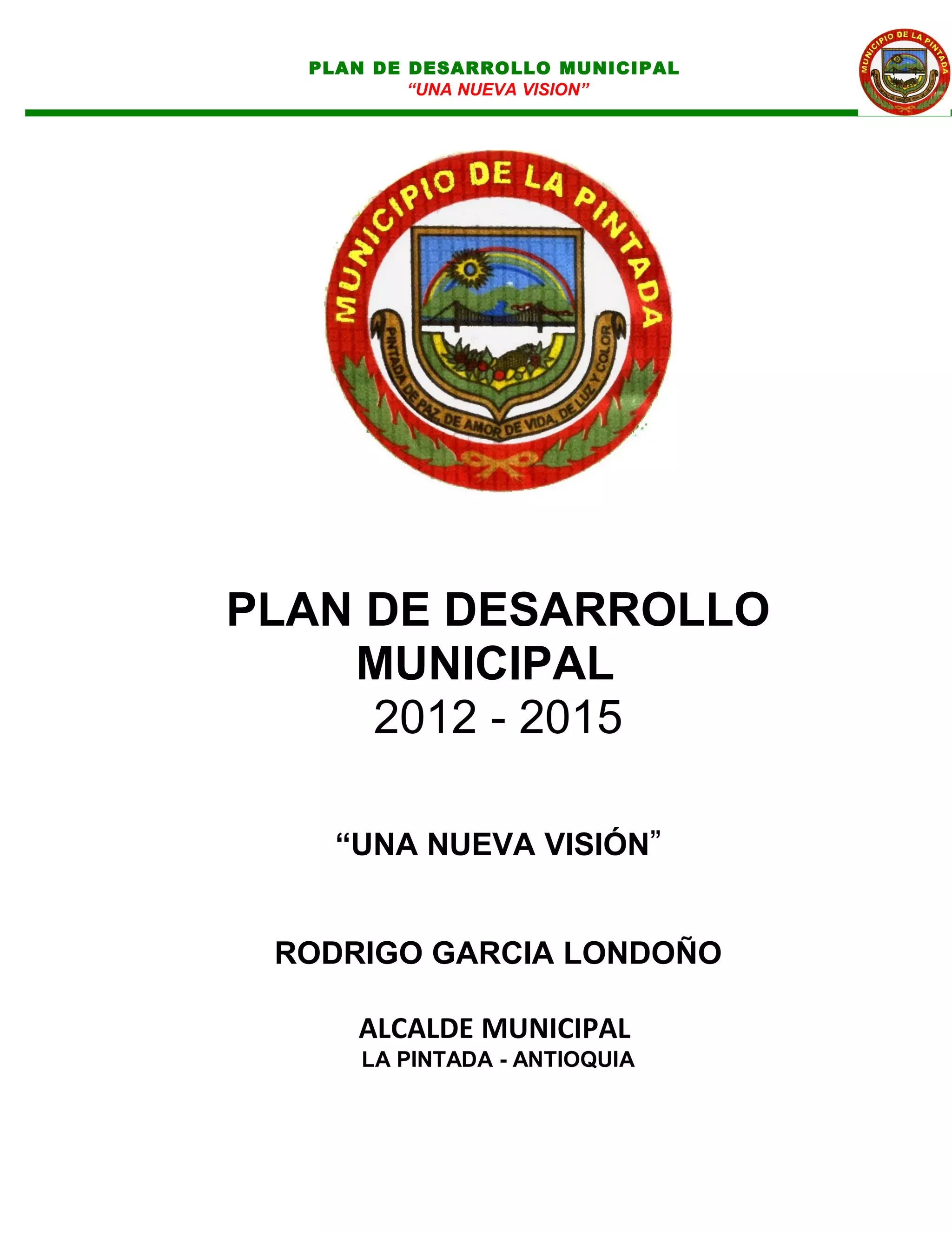 El documento presenta el Plan de Desarrollo Municipal "Una Nueva Visión" para el período 2012-2015. El plan incluye un diagnóstico de la situación actual del municipio con 20 secciones, 5 líneas estratégicas, el plan plurianual de inversiones, y la programación financiera y de recursos para el cuatrienio. El objetivo es mejorar la calidad de vida de los ciudadanos a través del desarrollo educativo, la inclusión social, la seguridad, el desarrollo sostenible y el fortalecimiento