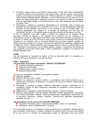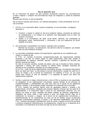 Un plan de desarrollo local es un instrumento útil para impulsar el desarrollo social de una comunidad rural o urbana. Se elabora de forma participativa mediante diagnósticos, análisis DAFO y definición de estrategias y proyectos. Su objetivo es mejorar la calidad de vida de la población mediante la participación ciudadana, el trabajo interinstitucional y la sostenibilidad de las acciones emprendidas.