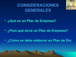 El documento presenta una guía sobre cómo elaborar un plan de empresa. Explica que un plan de empresa es fundamental para guiar las actividades de una empresa hacia el cumplimiento de sus objetivos a pesar de los cambios en el entorno. Detalla las secciones clave que debe contener un plan de empresa como la descripción del proyecto, análisis de mercado, plan de marketing, plan de inversiones y presupuesto. Finalmente, enfatiza la importancia de elaborar un plan de empresa realista y coherente que permita evaluar con claridad las posibilidades de éxito del negoc
