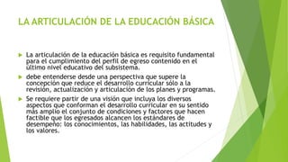 El documento resume los aspectos fundamentales de la articulación de la educación básica, incluyendo la necesidad de una visión amplia que abarque el currículo, los maestros, las prácticas docentes, y los materiales de apoyo. También presenta los antecedentes de los programas de español en México y explica que los nuevos programas de estudio para primaria y secundaria incluirán cambios diseñados a través de una metodología novedosa que involucra una comisión mixta.