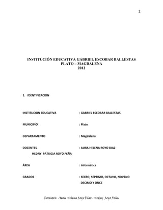 El documento detalla un plan de estudios de informática para la Institución Educativa Gabriel Escobar Ballestas, en el municipio de Plato, Magdalena, que abarca desde sexto hasta undécimo grado. Se enfatiza la importancia de la informática como herramienta pedagógica para mejorar la calidad educativa y fomentar habilidades en los estudiantes. Además, se establecen objetivos específicos y metodologías prácticas para el aprendizaje y se destacan los logros esperados en el proceso educativo.