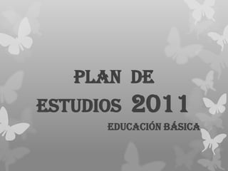 El documento presenta el plan de estudios 2011 para la educación básica en México. Establece 10 principios pedagógicos como base, entre ellos centrarse en los estudiantes, potenciar el aprendizaje, desarrollar competencias y evaluar para aprender. Define un perfil de egreso con 10 competencias que incluyen comunicación, pensamiento crítico, manejo de información, valores democráticos y expresión artística. Finalmente, presenta 4 campos de formación: lenguaje y comunicación, pensamiento matemático, exploración del mundo