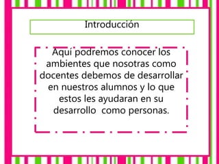 Este documento describe los ambientes de aprendizaje que los docentes deben desarrollar en los estudiantes. Enfatiza la importancia de un ambiente afectivo basado en el respeto, la confianza y la expresión de emociones. También destaca la necesidad de reconocer diferentes ritmos de aprendizaje y evitar la violencia, resolviendo conflictos de manera no violenta. El docente debe crear un entorno inclusivo que valore la diversidad.
