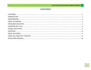 El documento presenta el plan de estudios del bachillerato general. Establece cinco campos disciplinares y describe el modelo educativo de transformación académica enfocado en el desarrollo de competencias. El modelo se basa en estrategias de enseñanza como los modelos inductivo, de adquisición de conceptos, integrativo, de enseñanza directa y de exposición y discusión.