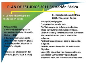 Este documento presenta el Plan de Estudios 2011 para la Educación Básica en México. Define las competencias clave, el perfil de egreso, y los estándares curriculares. También describe estrategias como el uso de las tecnologías de la información, la gestión educativa, y modelos de gestión escolar específicos para cada contexto con el fin de mejorar los aprendizajes de los estudiantes.