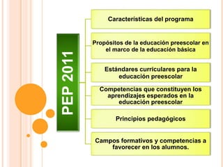 Este documento presenta el Programa de Educación Preescolar 2011 en México. Describe las características del programa, incluyendo sus propósitos, estándares curriculares y competencias esperadas. Identifica campos formativos como lenguaje, pensamiento matemático, exploración del mundo, desarrollo personal y expresión artística. El objetivo es desarrollar habilidades en niños para prepararlos para la educación básica.