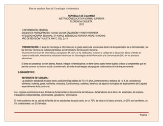Este plan de estudios para el área de Tecnología e Informática en el grado sexto presenta la información general, un diagnóstico del contexto estudiantil y regional, y los objetivos del área. El diagnóstico describe a los estudiantes como provenientes de diferentes regiones con niveles educativos y económicos variados, y la región del Caquetá como biodiversa pero con problemas ambientales. El área busca que los estudiantes utilicen de manera crítica las TIC para transformar su entorno.