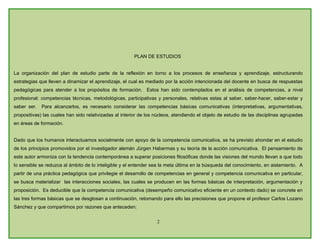 El documento presenta el plan de estudios de la Institución Educativa Normal Superior de Sincelejo. Describe que el plan se organiza en torno a los procesos de enseñanza y aprendizaje, y busca desarrollar competencias técnicas, metodológicas, participativas y personales en los estudiantes. Se enfoca en promover las competencias comunicativas, interpretativas, argumentativas y propositivas de los estudiantes. El plan incluye disciplinas y áreas organizadas de acuerdo con los problemas institucionales y necesidades de la educ