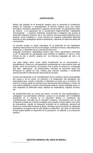 Este documento presenta el plan de estudios de música para el Liceo Matovelle en Bogotá, Colombia para el año 2011. El plan describe la justificación del área de música para el desarrollo integral de los estudiantes, los objetivos generales y específicos, las competencias, y el marco teórico y metodológico. Se dividen los contenidos en tres etapas de acuerdo al desarrollo psicológico de los estudiantes y se propone una metodología de aprendizaje experiencial creativo.