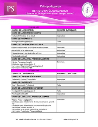 El documento detalla el plan de estudios del Instituto Católico Superior en la carrera de psicopedagogía, organizado por años y campos de formación. Incluye una variedad de asignaturas como teología, psicología y prácticas psicopedagógicas, además de seminarios y talleres. El enfoque está en la formación integral de los estudiantes en el diagnóstico e intervención en el ámbito educativo y psicológico.