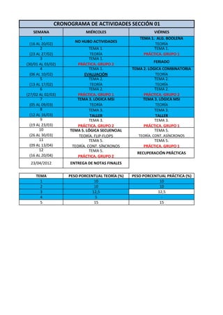 El cronograma de actividades de la Sección 01 incluye 12 semanas con temas de álgebra booleana, lógica combinatoria, lógica MSI y lógica secuencial. Cada tema incluye sesiones de teoría los miércoles y prácticas los viernes divididos en grupos. El peso porcentual de la teoría y práctica varía entre temas, con mayor énfasis en lógica MSI y lógica secuencial.