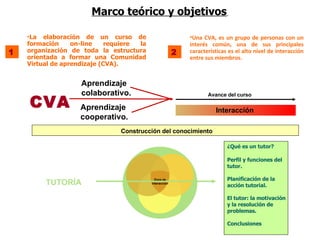 El documento describe el papel y las funciones del tutor en un curso de formación en línea. Explica que el tutor debe facilitar la interacción entre los miembros de la comunidad virtual de aprendizaje, orientar a los alumnos y motivarlos. También debe planificar actividades de aprendizaje, proporcionar recursos y retroalimentación, y evaluar el progreso de los estudiantes. El tutor juega un papel fundamental como facilitador en el proceso de construcción del conocimiento.