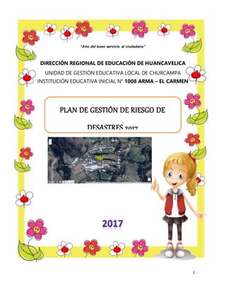 Este documento presenta el Plan de Gestión de Riesgo de Desastres 2017 de la Institución Educativa Inicial N° 1008 Arma. El plan tiene como objetivo proteger la vida e integridad de los estudiantes y personal ante posibles desastres como heladas. El plan se basa en la ley y ha sido aprobado por la directora para su implementación. Se difundirá a toda la comunidad educativa para que participen en la prevención de riesgos.