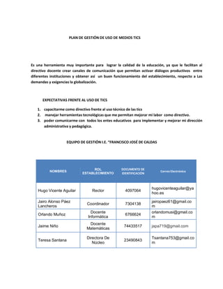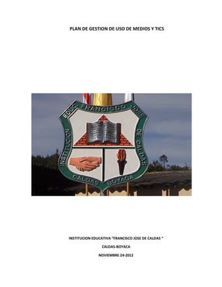 Este documento presenta el plan de gestión de uso de medios y TIC de la Institución Educativa "Francisco José de Caldas" en Caldas, Boyacá. El plan busca capacitar a la comunidad educativa en el uso de las TIC para mejorar la calidad educativa y la comunicación. Incluye un diagnóstico DOFA, objetivos, estrategias y acciones como conformar un equipo de gestión de TIC, capacitar docentes, mejorar la infraestructura tecnológica e implementar proyectos pedagógicos con TIC.