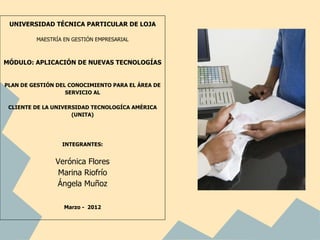 Este documento presenta un plan de gestión del conocimiento para el área de servicio al cliente de la Universidad Tecnológica América (UNITA). El plan busca identificar, clasificar y distribuir el conocimiento de los empleados para mejorar la atención a los estudiantes y docentes. Propone usar wikis, redes sociales y videos para compartir las mejores prácticas de servicio entre las secretarias de las diferentes facultades.