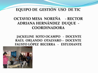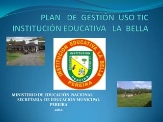El documento presenta el equipo de gestión del uso de TIC de la Secretaría de Educación Municipal de Pereira para el año 2012. El equipo está conformado por el rector Octavio Mesa Noreña, la coordinadora Adriana Hernández Duque, y los docentes Jackeline Soto Ocampo y Raúl Orlando Otalvaro. El objetivo es implementar el uso de TIC en los procesos directivos, administrativos y académicos de la institución educativa La Bella para formar ciudadanos digitales competentes en los próximos 3 años.