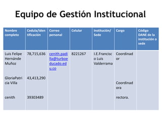 Este documento presenta un plan de gestión de uso de medios y TIC para la Institución Educativa Francisco Luis Valderrama. Incluye un diagnóstico institucional, objetivos, líneas estratégicas, programas, acciones e indicadores. El plan busca optimizar los procesos administrativos, fortalecer el uso pedagógico de las TIC y motivar a la comunidad en el uso de las tecnologías.