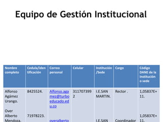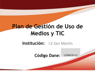 Este documento presenta el plan de gestión de uso de medios y TIC de la Institución Educativa San Martín. Incluye un diagnóstico institucional, objetivos, metas y acciones en áreas como gestión directiva, académica, administrativa y de la comunidad. El plan busca incorporar las TIC en los procesos educativos, capacitar docentes, mejorar la infraestructura tecnológica y promover su uso entre la comunidad educativa.