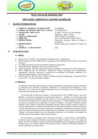 El documento presenta el Plan Anual de Trabajo 2015 de la Institución Educativa No 80241 "Vicente Luis Vera Miranda" en Samne, Otuzco, La Libertad. El plan tiene como objetivo aplicar el enfoque ambiental y gestionar riesgos de desastres de acuerdo a la normativa legal y técnica del sector educación. Se describe la infraestructura física de la institución y las zonas de seguridad. El plan busca prevenir, reducir y atender los daños a la vida e infraestructura mediante acciones de corto, median