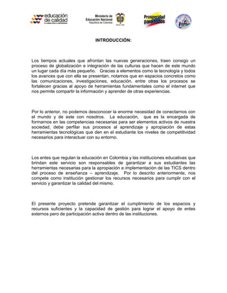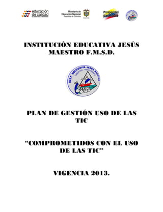 El documento presenta el plan de gestión del uso de las TIC de la Institución Educativa Jesús Maestro F.M.S.D. para el año 2013. Incluye un diagnóstico institucional, objetivos, metas, programas y proyectos relacionados con la implementación y uso de las TIC en las diferentes áreas de gestión de la institución, así como estrategias de seguimiento y difusión.