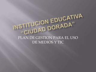 El documento presenta un plan de gestión para el uso de medios y TIC en una institución educativa. El plan busca reorganizar los procesos educativos incorporando las TIC para ofrecer una educación de calidad, mayor cobertura, eficiencia y sostenibilidad. Se propone generar propuestas pedagógicas mediadas por TIC aplicables en todos los niveles, capacitar a docentes en el uso pedagógico de TIC, y destinar recursos para mantener la infraestructura tecnológica.