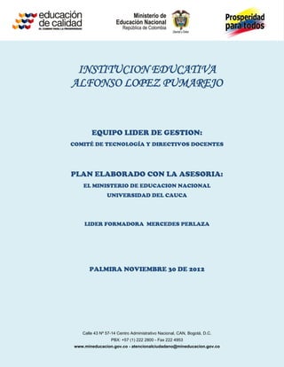 El documento presenta el plan de gestión de uso de medios y TIC de la Institución Educativa Alfonso López Pumarejo. El plan fue elaborado con la asesoría del Ministerio de Educación Nacional y la Universidad del Cauca, y tiene como objetivo mejorar los procesos educativos a través de la incorporación de las TIC. El plan incluye una misión, visión y metas relacionadas con el uso de las TIC, así como estrategias para su implementación en las diferentes áreas de gestión de la institución.