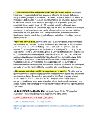 El documento presenta el plan de gobierno de Pedro Pablo Kuczynski para la educación en Perú. Propone mejorar la calidad de la educación primaria y secundaria pública, especialmente en zonas pobres, a través de mejoras salariales para profesores, infraestructura y acceso a libros. También busca apoyar más la educación técnica y reformar las universidades para fomentar la investigación e imponer requisitos más estrictos para los profesores. Finalmente, sugiere establecer becas para estudios científ